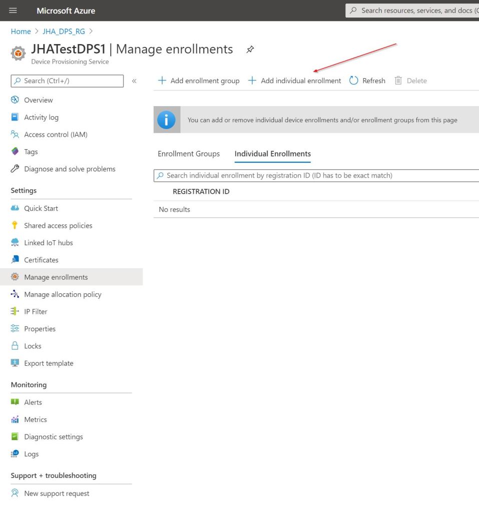 The process of enrolling a single IoT device with the Device Provisioning Service is pretty straightforward and you will only need a few pieces of information to complete the process. You can start the process by navigating to the Manage Enrollments section in your DPS instance and then clicking on +Add individual enrollment: