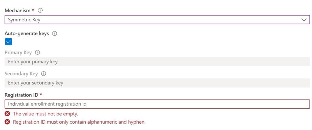 Select the Attestation Mechanism such as X.509, Symmetric Key or TPM. Your selection here will display different controls to enter information. For example, selecting Symmetric Key will display Primary/Secondary Key information, along with Registration ID for the device.