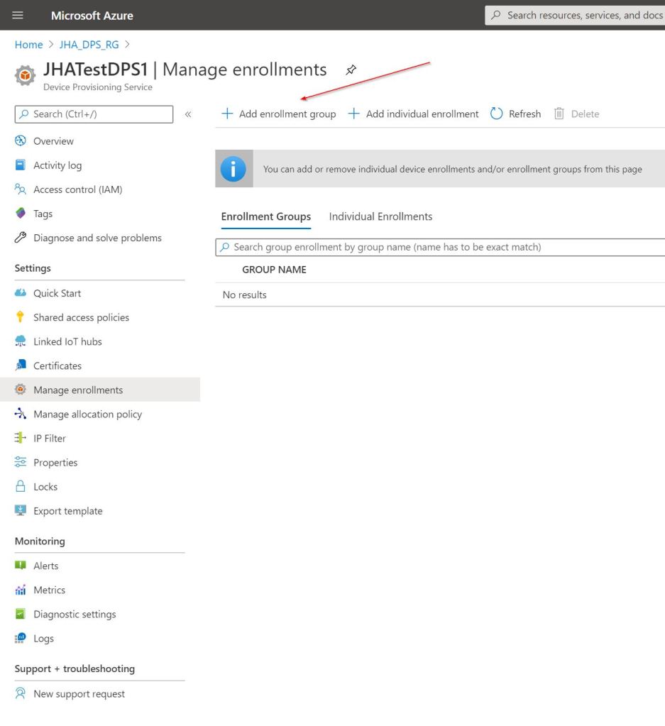 The process for enrolling a group of devices is similar to individual enrollments but with some significant differences. You can start the process by navigating to the Manage Enrollments section in your DPS instance and then clicking on +Add enrollment group: