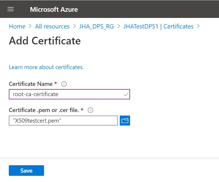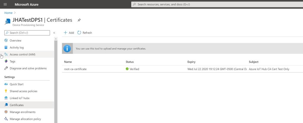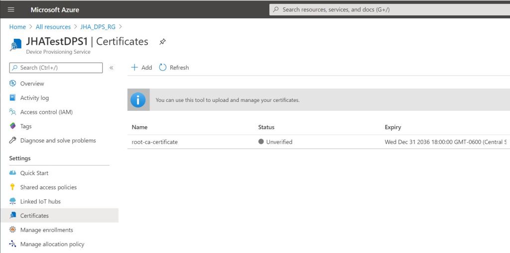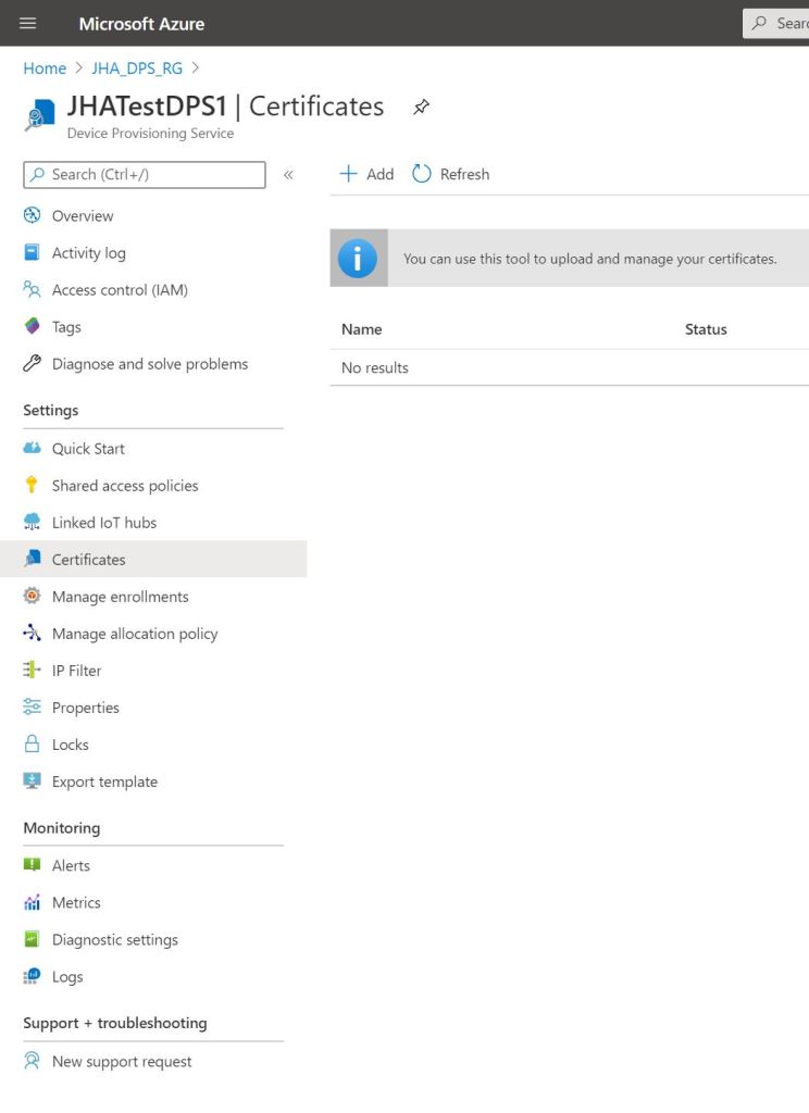 Once you have your root certificate, return to the Azure Portal and navigate to the Certificates section under Settings in your DPS instance.