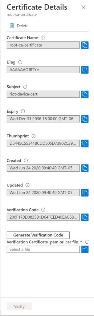 Once generated, return to the Certificate Details page in Azure Device Provisioning Service and add your verification certificate by clicking on Verification Certificate. Once uploaded, the Verify button should light up and you can click on that to have DPS verify the certificate. If successful, you will see that the certificate status will now show as Verified.