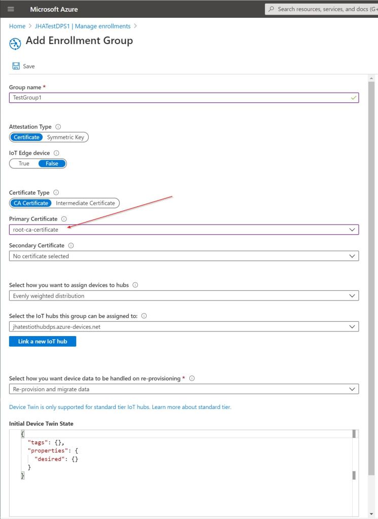 The next step is to create the group enrollment in DPS and select the Primary Certificate with the root CA certificate you just uploaded and verified in DPS. Navigate to the Manage Enrollments page in DPS and click on +Add enrollment group to create a group enrollment record. Give the group a name and make sure the Attestation Type is set to Certificate. When you open the dropdown for Primary Certificate you should see the certificate name you created earlier. Select this as your primary certificate and fill out the remaining information and then click Save.